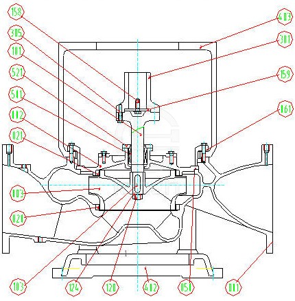 該泵為臥式單級單吸結(jié)構(gòu),主要有泵體,泵蓋,葉輪,泵軸,電機聯(lián)接架,剛性聯(lián)軸器,軸封,導(dǎo)軸承,泵座等組成。