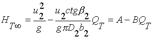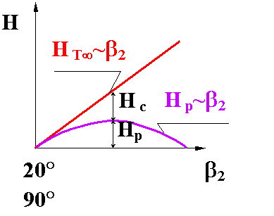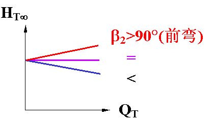 上圖表示了HT∞與QT的線性關系,斜率隨著β2變,后彎葉片的HT∞--QT的關系曲線稱為離心泵的“理論特性曲線”。