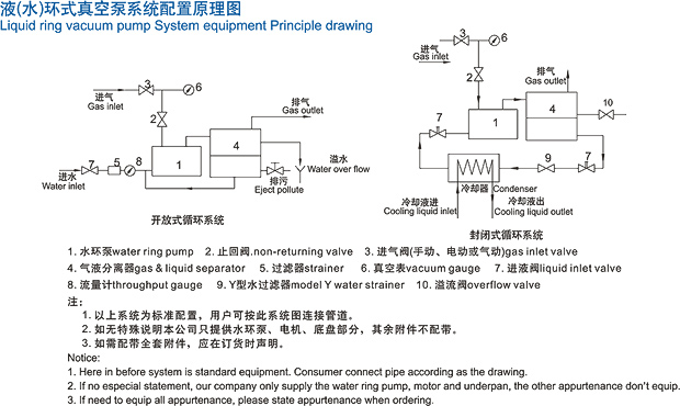 本公司液水環(huán)式真空泵可提供以下選擇: 1、根據(jù)真空度的不同可選擇: ●在1.3×104~1×105 Pa(100~760 Torr) 區(qū)間長期運轉,選用單級SK型水環(huán)式真空泵。 ●在5×103~1.3×104Pa(40~100Torr)區(qū)間長期運轉,選用雙級2YK型水環(huán)式真空泵。 ●在1×103~1.3×104Pa(8~40Torr)區(qū)間長期運轉,選用2YK型雙級油環(huán)真空泵。 2、工作介質可選擇: ●常溫水,以≤15℃為佳,一般不得高于40℃ ●變壓器油或其它粘度低飽和蒸汽壓低的工業(yè)油,高適用溫度60℃。如電工行業(yè)真空干燥。 ●化工液體,直接選用化工原料,要求飽和蒸汽壓低的液體,如乙醇胺等。 ●除常溫水外,選用其它工作介質應配置氣液分離器、冷卻器等,泵軸動密封應采用機封。詳細性能參數(shù)見性能表。 3、軸動密封選擇: ●一般使用場合可選用盤根密封。 ●要求無泄漏使用場合應選用機封。 4、過流零件材質選擇: ●除軸外,其余零件均為鑄鐵或銅合金,適用于抽吸無腐蝕性的氣體。 ●304和316不銹鋼。適用于抽吸含一定腐蝕性氣體。 ●工程塑料,適用于抽吸含酸性的腐蝕性氣體。 5、如需一邊抽真空一邊輸送氣體,排氣口壓強超過大氣壓時可根據(jù)以下方案選擇: ●如排氣口壓強大于0.15MPa,不得用真空泵改裝,應選用專門的雙級液環(huán)壓縮機。配套電機功率應增大,應配套專門的氣液分離器及自動排水裝置。 ●如排氣口壓強高于大氣壓而低于0.15MPa時,可用真空泵改裝為液環(huán)壓縮機使用。 6、系統(tǒng)配置型式 ●當排出口工作液不回用或只有部分回用,采用開放式循環(huán)系統(tǒng)。 ●當排出口工作液必須回用不得外排時,應采用封閉式循環(huán)系統(tǒng)。