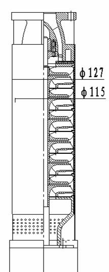 圖2代表了今后的發(fā)展趨勢,其單級(jí)揚(yáng)程大約在35米左右,其單級(jí)軸向高度只有85毫米,如果做一臺(tái)100米揚(yáng)程的井泵只需要3級(jí)葉輪和泵體,加上進(jìn)水節(jié)和出水閥,泵體總長不到0.6米。而且其水泵效率與可靠性都會(huì)有所提高。 下表是我們要設(shè)計(jì)的井用潛水泵與國內(nèi)外同類井泵的技術(shù)參數(shù)比較: