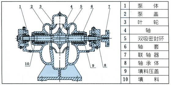 S、SH型單級(jí)雙吸泵的主要另件有:泵體、泵蓋、葉輪、軸、雙吸密封環(huán)、軸套、軸承等。除軸的材料為優(yōu)質(zhì)碳素鋼外, 其馀多為鑄鐵制成。