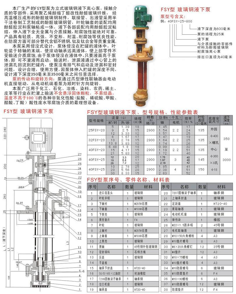 玻璃鋼(酚醛樹脂)對(duì)非氧化性酸(鹽酸、稀硫酸、磷酸等)、鹽類溶液、水都有良好的耐蝕性,不耐堿和氧化性酸(硝酸、鉻酸等)的腐蝕,高耐溫度約為120~150℃,低溫度為-20℃。本單位應(yīng)用此材料生產(chǎn)的SY型立式玻璃鋼液下泵、WSY型泵為立式玻璃鋼液下旋渦泵、FSY型泵為立式玻璃鋼液下離心泵。該泵因伸入貯罐,貯槽的深度長短不同,設(shè)計(jì)液下深度500mm--3000mm之間任意選擇。只要液體高于泵體,即可不灌液而起動(dòng)送液,平蓋板下設(shè)有泄漏孔,液體不會(huì)向貯罐外泄漏。