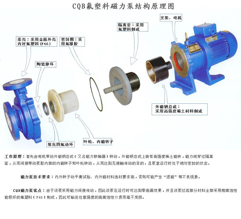 CQB型磁力泵是化工流程中杜絕跑、冒、滴、漏現(xiàn)象,消除環(huán)境污染,創(chuàng)造“無(wú)泄漏車間”、“無(wú)泄漏工廠”,實(shí)現(xiàn)安全、文明生產(chǎn)的理想用泵。