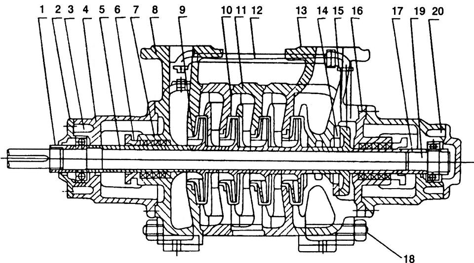 GC型多級(jí)泵的主要零件有軸、軸套、進(jìn)水段、葉輪、導(dǎo)翼、密封環(huán)、中段、出水段、平衡環(huán)、平衡盤(pán)、尾蓋。