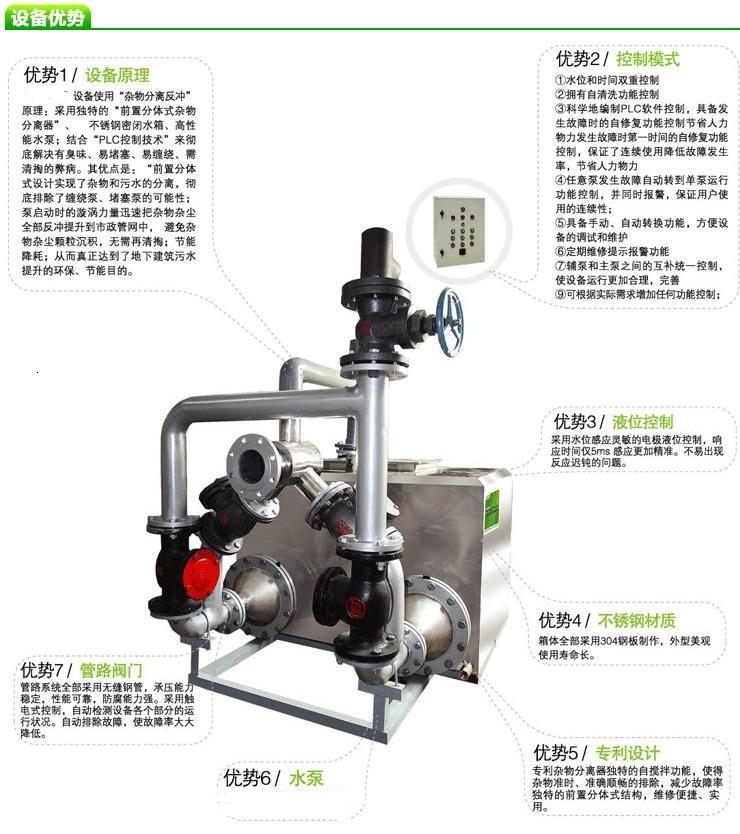 全自動地下污水提升器(提升設(shè)備)是一款適用于餐飲業(yè)、娛樂行業(yè)、休閑服務(wù)業(yè)、建筑工程、商業(yè)工程、化工廠、生產(chǎn)加工廠、制藥廠、醫(yī)用、市政工程等地下污水排放系統(tǒng)的全自動地下污水提升器。污水處理一直都是令人頭疼的問題,傳統(tǒng)的做法都是在地下挖集水井(污水坑),在集水井中放置污水泵,也就是俗稱的“一坑兩泵”,一坑兩泵的污水處理的方式存在異味、污水泵易堵塞、污水坑清掏難、污染周圍環(huán)境等弊病。金利潔牌PW系列全自動污水提升器采用雙泵雙分離器,雙泵雙分離器交替工作,互為備用,任意泵發(fā)生故障都可以在PLC控制系統(tǒng)下自動轉(zhuǎn)到單泵運行控制,滿足地下污水持續(xù)提升排放的需要。雜物分離專利技術(shù)更是解決了易堵塞、清掏難的問題,污物被濾網(wǎng)濾出,暫存機體,后隨水流壓力自行排出,實現(xiàn)真正的免清掏,污物并不接觸水泵葉輪,不會因污物纏繞造成堵塞,整個污水處理過程都是在密閉性良好的不銹鋼箱體中進行,不會出現(xiàn)污水和異味外泄的情況。傳統(tǒng)的利用兩個液位控制水泵的啟停很容易出現(xiàn)低液位不識別的問題,使水泵失去控制,而全自動地下污水提升器采用PLC控制系統(tǒng)結(jié)合高液位一個高液位的獨有技術(shù),很好的解決了低液位不識別問題,響應(yīng)時間僅為5ms,感應(yīng)更靈敏,反應(yīng)更快。