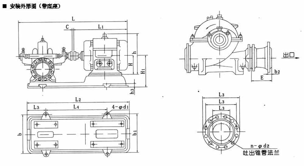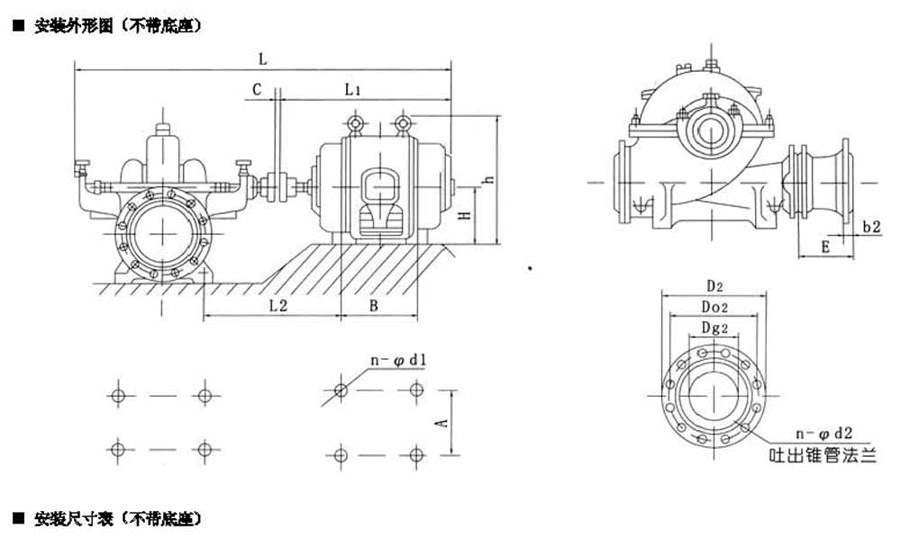 S、SH型單級雙吸中開泵安裝尺寸: