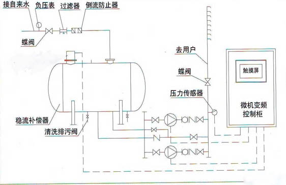 5,系統(tǒng)供水穩(wěn)定(即使管網(wǎng)臨時斷水,也能通過水箱正常供水),充分保證系統(tǒng)末端壓力。