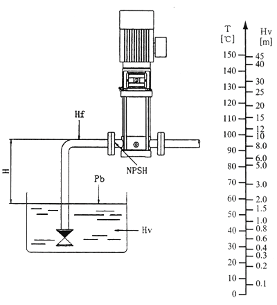 如果泵中的壓力低于輸送液體的蒸汽壓力、可能發(fā)生氣蝕,確保泵進(jìn)口側(cè)有一小壓力,大吸程H[m]可按下式計算: