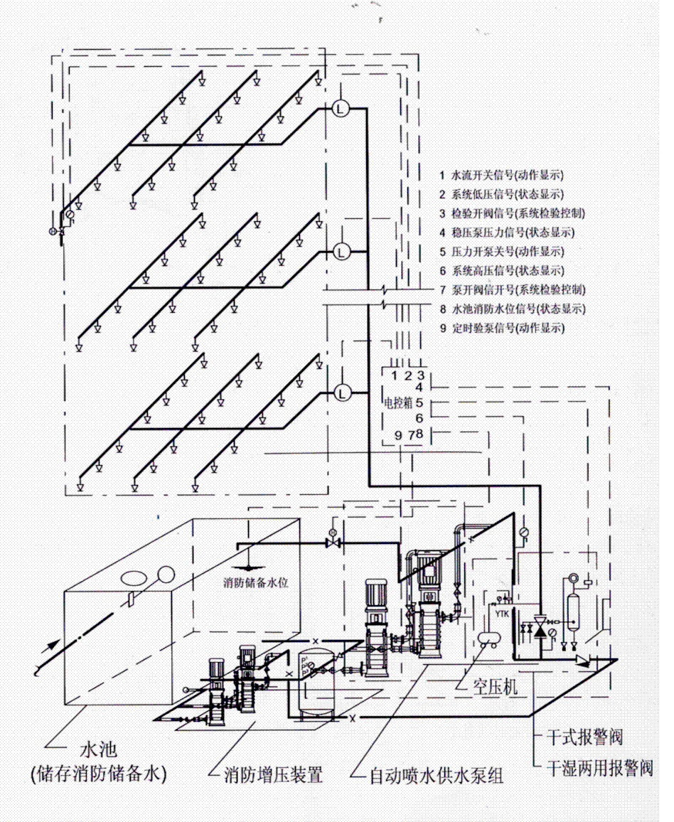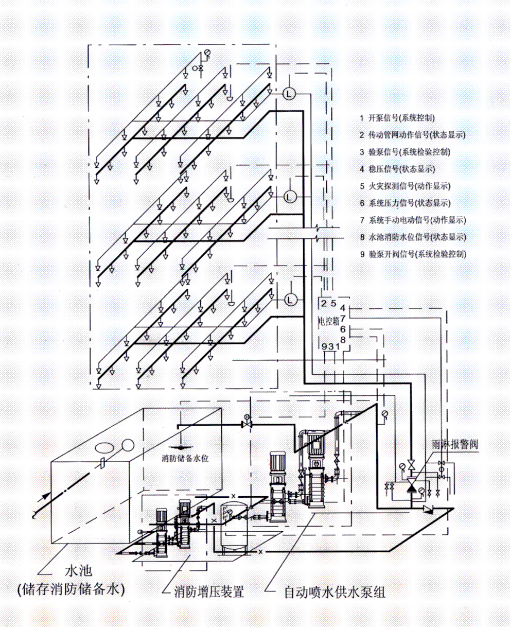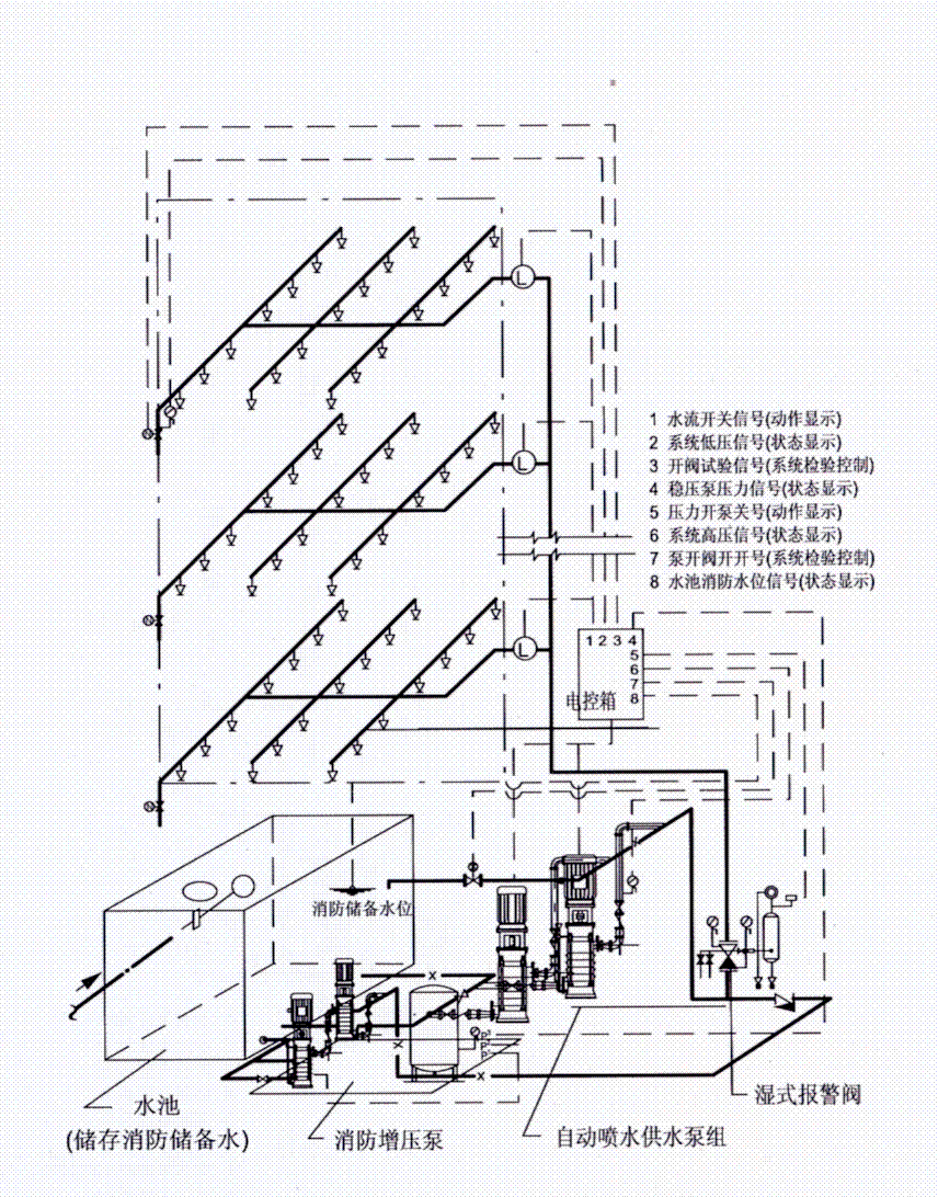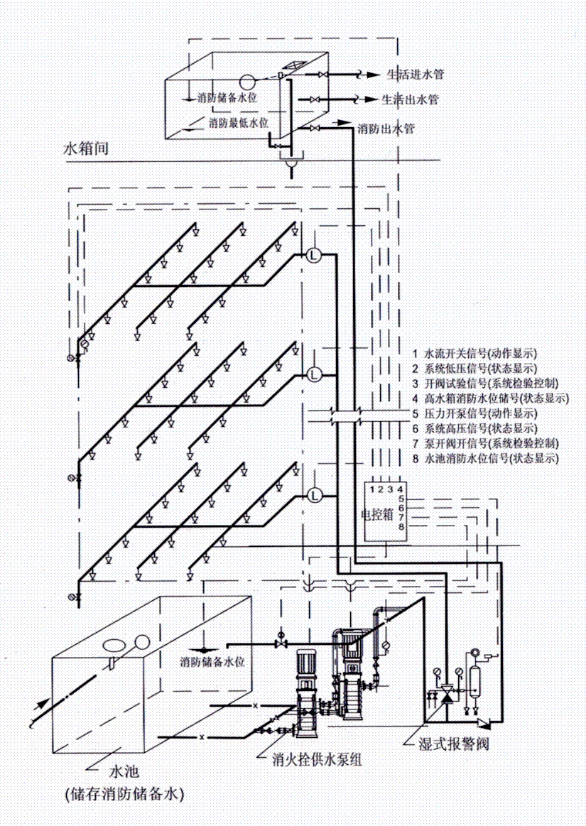 自動(dòng)噴水濕式系統(tǒng)(高水箱穩(wěn)壓)原理圖