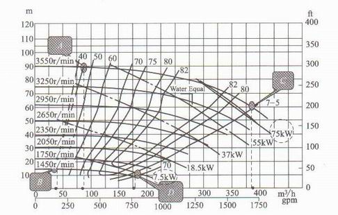 在變轉(zhuǎn)速下泵的小流量限制是有眾多不同速度下的泵的性能曲線上左側(cè)的小流量限制點所形成的一條小流量限制線(由A、B 兩點連成的線),如圖1所示。在變轉(zhuǎn)速下泵的大流量限制是由眾多不同轉(zhuǎn)速下的泵性能曲線上右端的限制點所形成的一條限制線(如由C 、D兩點連成的線)。