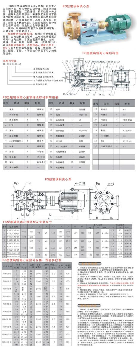 FS型臥式玻璃鋼離心泵,結(jié)構(gòu)設(shè)計先進(jìn)合理,標(biāo)準(zhǔn)化程度高,零件通用性,互換性強(qiáng),拆卸檢修十分方便。接觸介質(zhì)的部件,采用聚乙烯醇縮丁醛改性酚醛玻璃纖維,經(jīng)高溫模壓成形的酚醛玻璃鋼制件。FS型臥式玻璃鋼離心泵產(chǎn)品具有輕質(zhì)、高強(qiáng)、不變形、耐溫、耐腐蝕等優(yōu)良性能。FS型臥式玻璃鋼離心泵在防腐方面可部分替代含鉬不銹鋼,鈦及鈦合金等貴重金屬。