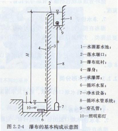 人工瀑布的基本構(gòu)成是由瀑布的水源蓄水池、落水堰口、瀑布底襯、瀑身、承瀑潭或稱循環(huán)水池、循環(huán)泵、凈水設(shè)備、循環(huán)管道系統(tǒng)及照明彩燈等組成,見圖2. 2-4。