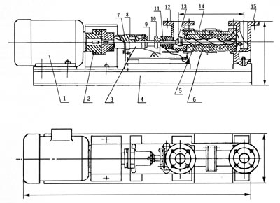 I-1B系列單螺桿濃漿泵由電動(dòng)機(jī)、聯(lián)軸器、泵和底座四個(gè)部分組成(見附圖)。