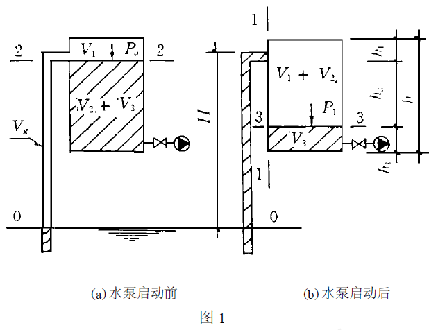 泵啟動(dòng)后,液面下降,達(dá)到穩(wěn)定運(yùn)行工作后,罐內(nèi)應(yīng)存有一定體積量V3的水,而氣體之外的罐內(nèi)空氣體積為V1+V2。罐內(nèi)部的壓力為P1,壓力小于外界大氣壓力Pa。