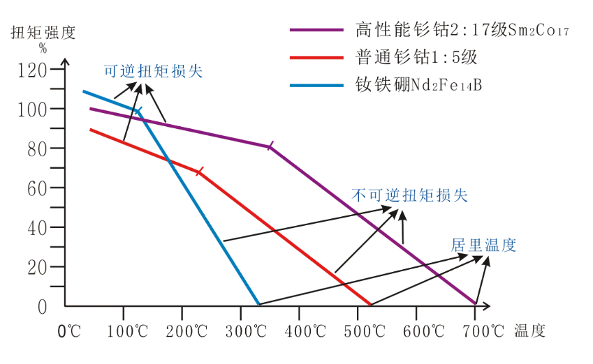 當(dāng)溫度超過150℃,釹鐵硼材質(zhì)的磁鋼將會進入不可逆扭轉(zhuǎn)損失。當(dāng)溫度超過250℃,普通釤鈷材質(zhì)的磁鋼將會進入不可逆扭轉(zhuǎn)損失。