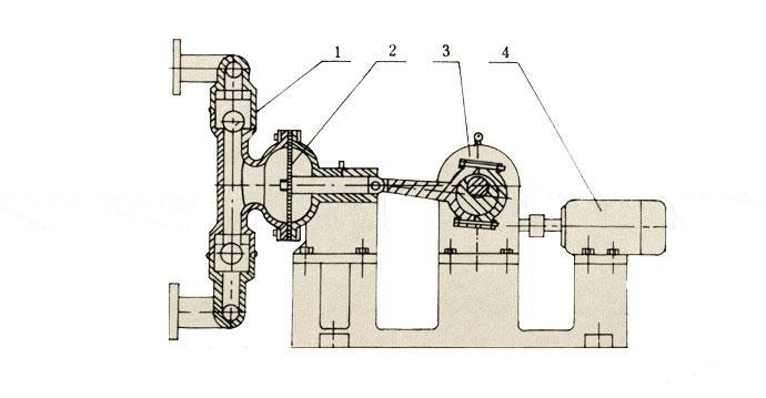 電機(jī)(4)通過減速箱(3)帶動(dòng)左右兩端柱塞上面的隔膜(2)一前一后往復(fù)運(yùn)動(dòng)。在左右兩個(gè)泵腔內(nèi),裝有上下四個(gè)單向球閥(1)隔膜的運(yùn)動(dòng),造成工作腔內(nèi)的容積的改變,迫使四個(gè)單向球閥交替地開啟和關(guān)閉,從而將液體不斷地吸入和排出。DBY型電動(dòng)隔膜泵是一種新型的泵類,近年來,由于在隔膜材質(zhì)上取得了突破性的進(jìn)展,國際上越來越多的工業(yè)化國家采用此種型式的泵,取代部份離心泵、螺桿泵,來應(yīng)用于石化、陶瓷、冶金等行業(yè),產(chǎn)品設(shè)計(jì)均參考美國ABEL公司樣機(jī),該泵適用于低壓,即出口壓力≤3kgf/cm2的場合.