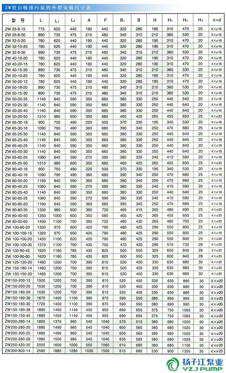二、ZW型自吸式無(wú)堵塞排污泵(安裝尺寸)