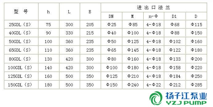 GDL型立式多級(jí)管道離心泵安裝尺寸表: