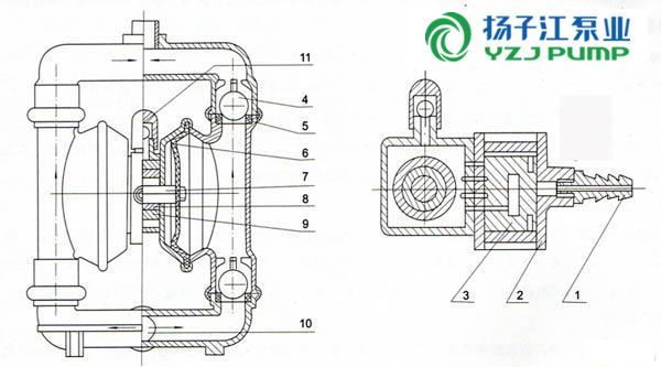 1.進(jìn)氣口 2.配氣閥體 3.配氣閥 4.圓球 5.球座 6.隔膜 7.連桿 8.連桿銅套 9.中間支架 10.泵進(jìn)口 11.排氣口