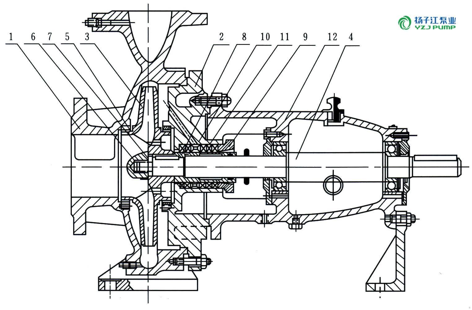 IS、IR型泵系根據(jù)國家標準ISO2858所規(guī)定的性能和尺寸設計的,主要由泵體(1)、泵蓋(2)、葉輪(3)、軸(4)、密封環(huán)(5)、軸套及懸架軸承部件(12)等所組成。