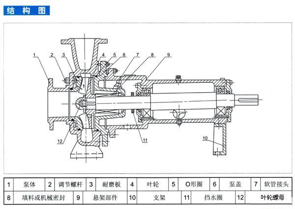 1. XWJ型紙漿泵為單級(jí)單吸懸臂式結(jié)構(gòu),主要山泵體、葉輪、泵蓋、耐磨板及懸架部件組成;