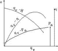 (2)離心泵的性能曲線 從前面的討論可以看出,對一臺離心泵,在轉(zhuǎn)速固定 的情況下,其壓頭、軸功率和效率都與其流量有一一對應(yīng)的關(guān)系。這些關(guān)系的圖形表示就稱為離心泵的性能曲線,包括qV-H曲線、qV-Pa曲線和qV-η曲線,這些關(guān)系一般都通過實驗來測定。 離心泵的特性曲線一般由離心泵的生產(chǎn)廠家提供,標(biāo)繪于泵產(chǎn)品說明書中,其測定條件一般是20℃清水,轉(zhuǎn)速也固定。典型的離心泵性能曲線如圖所示。