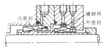 適用于高壓密封,一般串聯(lián)二級;亦可用于介質(zhì)壓力不高,但密封要求嚴(yán)格的場合。兩密封間的封液利用液封環(huán)(見圖)進(jìn)行強制循環(huán),其壓力低于介質(zhì)壓力,目的是潤滑密封。當(dāng)內(nèi)密封失效時,外密封仍可保證密封,提高密封可靠性。密封系統(tǒng)見表1—22方式52