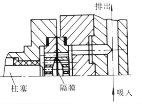 在柱塞泵缸前加一隔膜,柱塞在缸內(nèi)做往復(fù)運動,使缸內(nèi)油產(chǎn)生壓力,推動隔膜在隔膜腔內(nèi)前后鼓動,達(dá)到吸