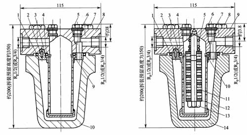 9-中間環(huán);10-過濾器體                                       6-排氣螺栓;7-密封墊;8,1 3-螺釘;9-過濾器蓋;