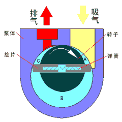 如圖為旋片式真空泵的工作原理示意圖。旋片式真空泵主要由泵體、轉(zhuǎn)子、旋片、端蓋、彈簧等組成。在旋片泵的腔內(nèi)偏心地安裝一個轉(zhuǎn)子,轉(zhuǎn)子外圓與泵腔內(nèi)表面相切(二者有很小的間隙),轉(zhuǎn)子槽內(nèi)裝有帶彈簧的二個旋片。旋轉(zhuǎn)時,靠離心力和彈簧的張力使旋片頂端與泵腔的內(nèi)壁保持接觸,轉(zhuǎn)子旋轉(zhuǎn)帶動旋片沿泵腔內(nèi)壁滑動。