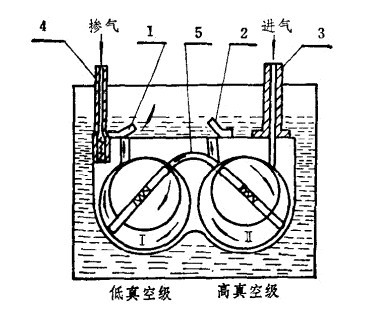 ![]() 圖2雙級泵的工作原理 1.低真空級排氣閥2.高真空級排氣閥3.進(jìn)氣管4.摻氣閥5.中間通道 |