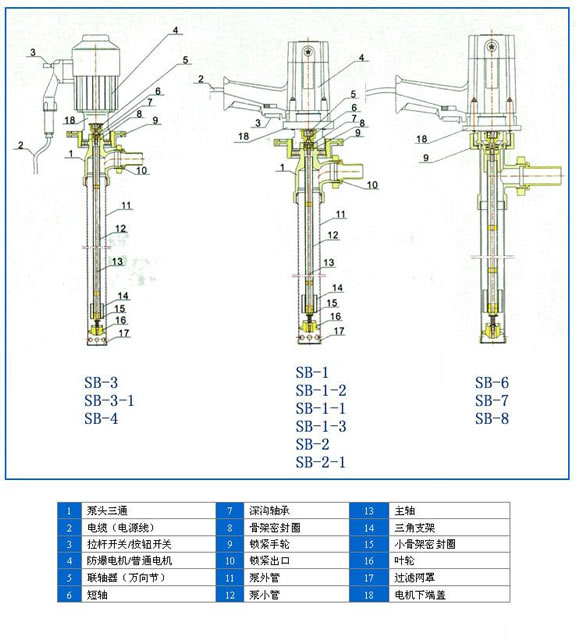 揚子江SB系列插桶泵(油桶泵,電動抽液泵)可以直接插入物料桶(大適用于符合GB/325-1991標(biāo)準(zhǔn)的鋼桶)中抽取桶中液體?奢斔透鞣N油料、帶腐蝕性化學(xué)藥水、其他液體。根據(jù)所輸送的液體性質(zhì),泵體沾濕部分材料可選用鋁合金、不銹鋼,316不銹鋼等組成。驅(qū)動電機配備單相標(biāo)準(zhǔn)電機,防爆電機,高轉(zhuǎn)速電機等多種選擇。根據(jù)材質(zhì),電機不同,型號可分為: SB-1,SB-2,SB-3,SB-3-1,SB-4,SB-5,SB-6,SB-7,SB-8系列鋁合金,不銹鋼或防爆型。我們備有詳細資料,歡迎索取。揚子江該系列泵可按防爆區(qū)域和非防爆區(qū)域選用,凡在防爆區(qū)域使用配置防爆型電機,這類電機分三種機組型號,當(dāng)使用條件含各種易燃易爆混合時,應(yīng)選用高組級。