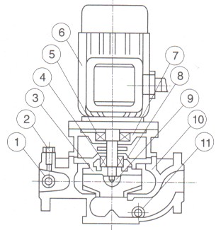 1、取壓閥 2、排氣閥 3、葉輪 4、機(jī)械密封 5、軸承 6、電機(jī) 7、聯(lián)體座 8、泵蓋 9、葉輪螺母 10、泵體 11、放水閥