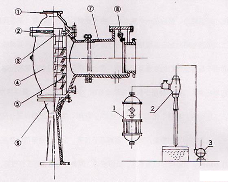水力噴射器由器體、器蓋、噴咀、噴咀座板、導(dǎo)向盤、擴壓管及單向閥等部件組成,噴咀用不銹鋼制造,噴咀座板由優(yōu)質(zhì)鋼加工,其余零件則系鑄鐵鑄造。噴咀采用多噴咀的結(jié)構(gòu)形式,以便得到較大的水—汽接觸,有利于熱交換的進(jìn)行,獲得較好的真空效果。噴咀座板加工精密,精度較高,以使噴射水流準(zhǔn)確地聚集在同一的焦點。導(dǎo)向盤用于減慢蒸汽(或空氣)的流速,使蒸汽均勻地導(dǎo)入器室以免噴射水流偏斜,降低抽射效能。整個裝置結(jié)構(gòu)緊湊精密,強度高,用于真空蒸發(fā)系統(tǒng)中,由于能把冷凝器的冷凝作用與真空泵的抽氣作用合并在一個設(shè)備中同時完成,大大地簡化了工藝流程,比之原來真空泵加舊式冷凝器的裝置,可以節(jié)省去真空泵、冷凝器、分水器等設(shè)備,并且還有下列優(yōu)點: