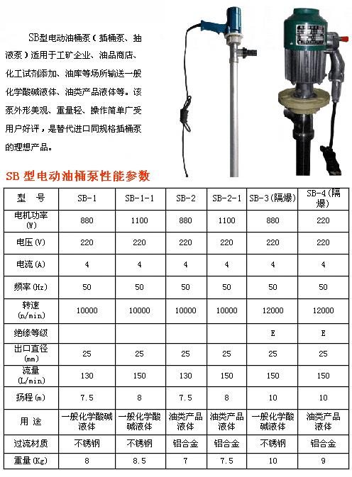 油桶泵抽液泵)使用于油泵、化工|企業(yè)、商店、航運(yùn)、農(nóng)村、抽吸不同液體。如在易燃易爆場(chǎng)合使用,可選用本廠生產(chǎn)的防爆型電動(dòng)抽液泵。使用防爆型電動(dòng)抽液泵時(shí)應(yīng)按CB38361-2<爆炸環(huán)境用防爆電氣設(shè)備>有關(guān)規(guī)定并正確使用防爆插頭插座。本系列產(chǎn)品使用于符合GB/325-1991標(biāo)準(zhǔn)的鋼桶和插入口大于Ф55MM其它容器的液體抽送。