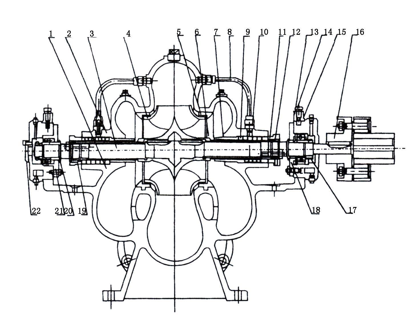 5、泵軸由兩個單列向心球軸承支承,軸承裝在泵體兩端的軸承體內,用黃油潤滑,雙吸密封環(huán)用以減少水泵壓水室的水漏回吸水室。